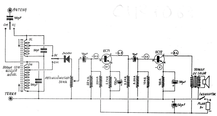 This dual-band receiver was found in documentation from the 1970s. The original transistors are germanium, but modifications can be made to use modern silicon transistors such as the BC558 or even BC548, by inverting the power supply polarity. The coils are formed by 20 + 80 turns for medium waves and 5 + 25 turns for short waves, with 28-wire on a ferrite rod. The antenna must be long, and the output transformer is the type found in old transistor radios.