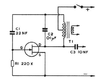 The frequency of this oscillator depends on T1 and C2. The transformer may be of the old audio type. The transistor can be any general purpose JFET.