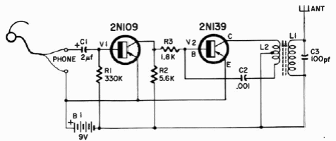 This short-range, medium-wave transmitter was found in a 1966 documentation. The transistors are germanium of the time. The coil is commercial grade.