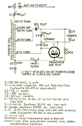 This radio uses the own tune signal to get energy for the transistor. The circuit was found in a February 1961 Radio Electronics Magazine. The circuit uses an earphone and a long antenna.