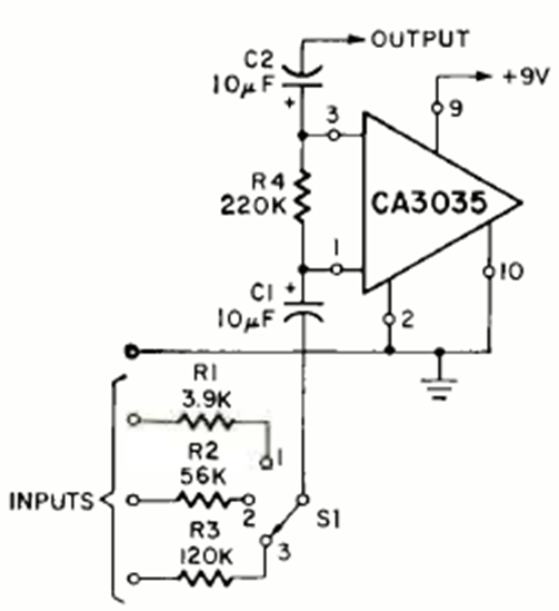 This circuit is from a Radio Electronics from February 1970. The circuit selects the input sensitivity by switching resistors. The integrated circuit is a type of the time.