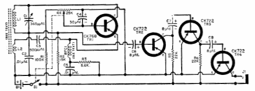 We found this circuit in a documentation from the 50s. It is based on CK722 germanium transistors. The output is for high impedance magnetic headphones.