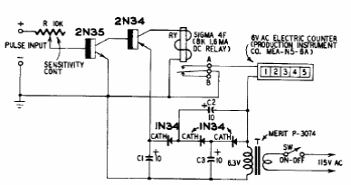 This circuit was found in an American book on transistors from the 60's. The transistors are germanium of the time, and the counter is of the electromechanical type.