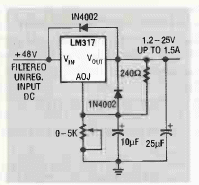 This is a voltage regulator circuit for currents up to 1.5 A with an output voltage adjustment for outputs from 1.2 to slightly less than the input voltage.