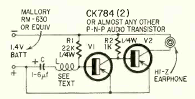 This circuit receives, through a coil, audio signals emitted by another coil connected to the output of a television or other equipment. The signal is applied to a headset which then functions as a wireless headset. The circuit for magnetic headphones can be adapted to use modern components. The circuit is from a 1963 Radio Electronics.