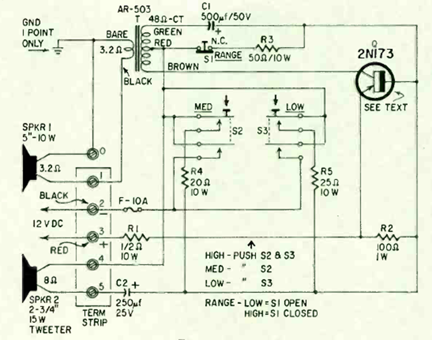 This circuit produces sounds of 6 different notes depending on the keys activated. The circuit is from a Radio Electronics from May 1965. The transistor must be equipped with a heat radiator.