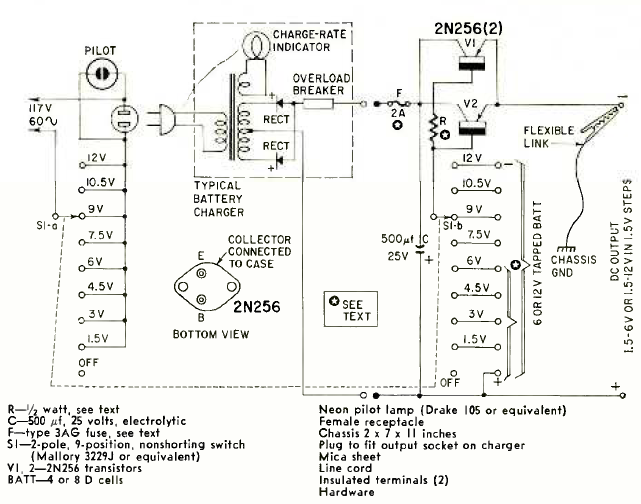 This benchtop power supply with various output voltages from 1.5 to 12 V was found in Radio Electronics magazine from August 1960. The circuit uses power transistors of the time.