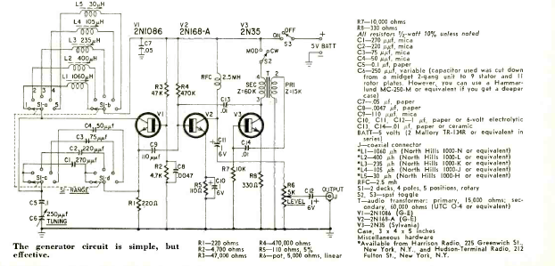 Aiming to generate signals in the bands used for maritime communications, this signal generator was published in Radio Electronics magazine in October 1961. The circuit uses 3 transistors and 5 frequency bands.