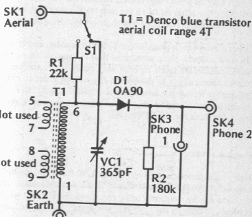 Found in English documentation from the 1980s, this circuit can use any germanium diode. The earphone can be crystal or high impedance magnetic.