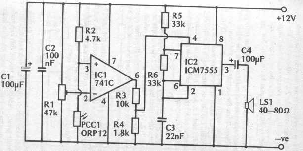 This circuit is intended to warn you if you forget to turn on the lights. We found it in old English documentation. The sensor is a common LDR.