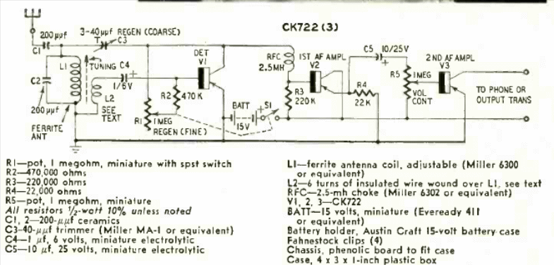 This receiver with earphone listening for the medium wave range was published in Radio Electronics magazine in February 1958. The circuit was powered by a 15 V battery.