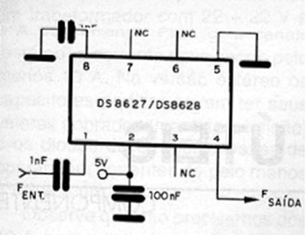 This circuit can be used in PLL, frequency synthesizer in FM and VHF receivers, reducing a frequency to a value that can be used by slower digital circuits. The DS8617 integrated circuit divides the frequency by 24 while the DS8628 divides by 20. The suffix of the integrated circuits determines the maximum operating frequency. Thus, those with 3 and 4 suffix have a maximum frequency of 130 MHz and those with suffix 2 and without suffix operate up to 225 MHz. The supply voltage is 5V and the input sensitivity is 100 mV for those with suffix 3 and 4 and 40 mV for those with suffix 2 and standard. The integrated circuit for this application is manufactured by National Semiconductor.