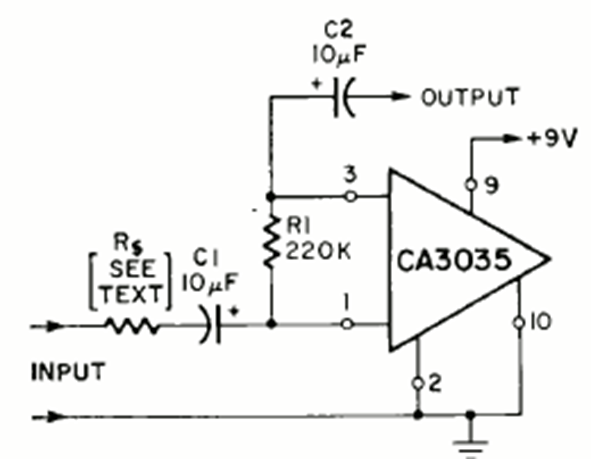 This amplifier uses an operational amplifier from the time. It was found in the February 1970 issue of Radio Electronics magazine. The gain is given by R1 which can be changed.
