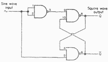 The circuit below shows how to configure 3 gates of a 7400 to obtain a rectangular signal from a sinusoidal. The circuit must be powered by 5V.