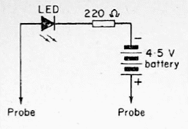This circuit can be powered by 2 or 3 small batteries. The resistor can have values between 220 ohms and 1k. The LED is any color. We found it in old English documentation.