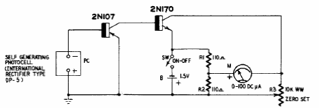 This sensitive photometer uses a photoelectric cell as a sensor. The circuit was found in an American publication from the 60's. The transistors are germanium of the time.