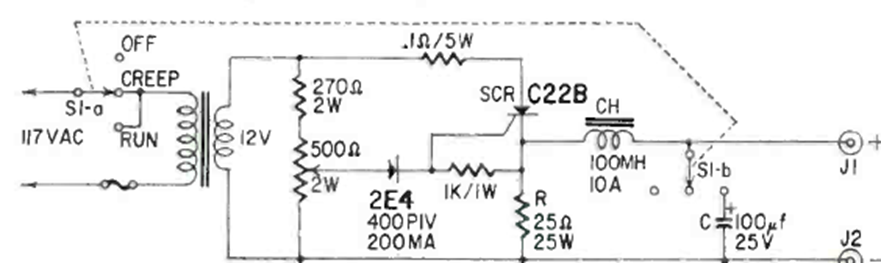 This electronic rheostat with SCR was found in the June 1964 Radio Electronics magazine. The SCR may be a modern type and the 2W potentiometer may be 470 ohms.