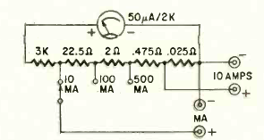 In the figure we have the circuit of a multi-range ammeter using a 50 uA full-scale instrument. The circuit is from Radio Electronics magazine from January 1960.
