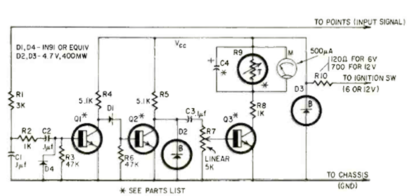This circuit was found in Radio Electronics magazine from September 1965. It uses a thermal compensation system for the indicating instrument. The circuit is for period cars that use contact breakers in the ignition system.