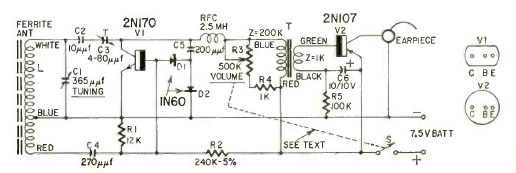 This simple two-transistor receiver was found in Radio Electronics magazine from September 1960. The transistors are from the time and listening is done through earphones.