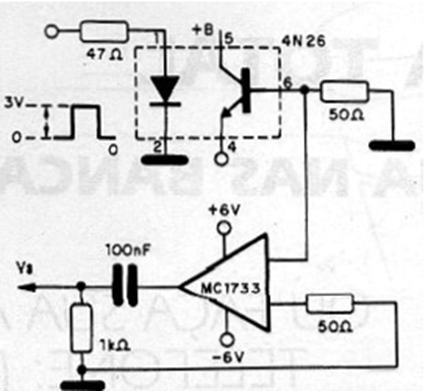 This circuit is suggested by Motorola, using a 4N26 type coupler and an MC1733 type operative. However, the configuration can be experimented with equivalent components. With this configuration switching times can be reduced from 2 to 3 us to 100 ns typically. The operational amplifier must receive symmetrical power supply and the input signal must be rectangular with an amplitude of 3V. For this type of signal, the output rises from 10% to 90% of 0.6 V in approximately 100 ns.