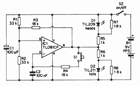 This circuit uses an operational amplifier that is still common today. The indication is made by LED and the power supply can be changed to values between 6 and 12 V.