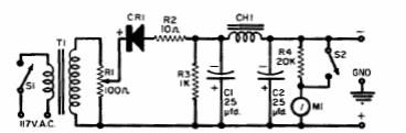 This simple power supply for transistors was found in documentation from the 1940s. The transformer has a 25V secondary in the original publication but can be 12V with 500mA to 800mA.