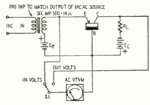 This circuit for testing the voltage gain of a transistor was found in the March 1953 issue of Radio Electronics. The circuit uses an AC voltmeter for this purpose and a signal source.