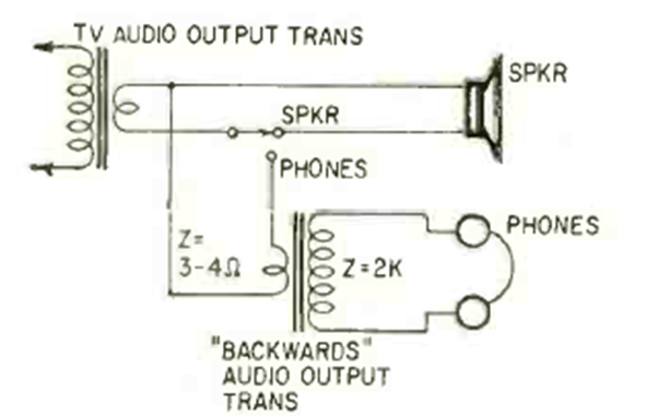 In the figure we see how to connect a high impedance phone to the output of a low impedance amplifier. In this case, volume control was not included. An output transformer is used to match impedances.