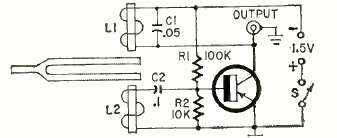 This circuit that uses a mechanical tuning fork was found in Radio Electronics magazine from June 1962. The circuit is powered by a battery or source.