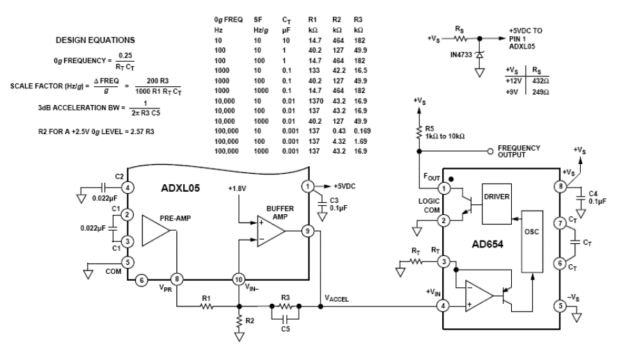 The circuit was suggested by Analog Devices (www.analog.com) in its Application Note AN-411 and consists of a circuit in which the output frequency varies directly with the acceleration applied to the sensor. This circuit is shown in the figure. Power can be supplied with voltages from simple sources between 9 V and 12 V. The sensor is a +/-5g ADXL05 that converts any acceleration applied directly into a voltage. This voltage is then applied to an AD654, which consists of a low-cost voltage-frequency converter. The table next to the diagram gives component values for various output frequency ranges. In this table we also have a breakdown of acceleration in terms of Hertz/g. The output voltage at pin 8 of the ADXL05 is +2.5 V without acceleration and varies 200 mV above or below this value for each 1g of acceleration detected. In the same diagram we have the formulas that make it possible to calculate the components to obtain specific characteristics for the project. In the design, the resistors must be precision and R1a must be approximately 50% of the value of R1b. High precision resistors can be used for calibration and then replaced with types with 1% tolerance.