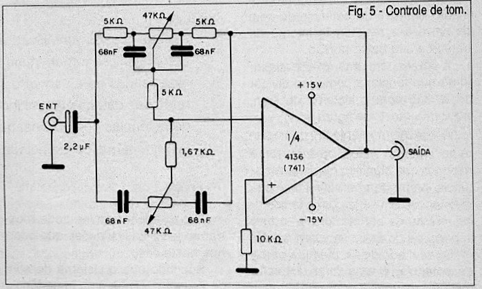The basis of this circuit is 1/4 of a 4136 integrated circuit which consists of a quadruple 741. We can use the 741 for a mono version, or the original for a stereo version. The power supply must be symmetrical at 15 V and as it is an audio circuit, sensitive to snoring, maximum care is recommended with the layout and signal input and output connections.