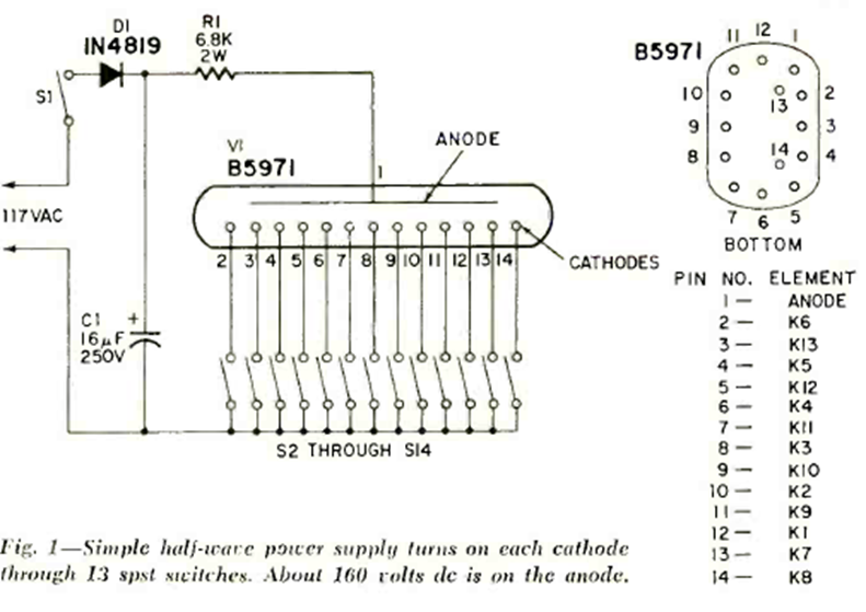 This experimental circuit with Nixie tube was found in the Radio Electronics magazine of March 1969. The circuit serves for demonstrations and also for testing these digital indicator tubes.