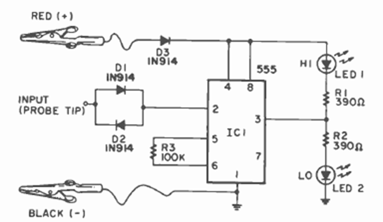 This simple logic probe circuit was found in the August 1980 issue of Radio Electronics magazine. The circuit works with both TTL and CMOS logic.