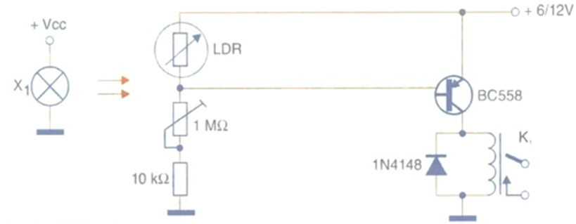This circuit is quite simple and if the LDR is mounted in an opaque tube with a lens, its sensitivity allows a separation of up to more than 1 meter between the sensor and the source. The light source is a 5 to 12 V lamp with at least 100 mA of current, depending on the separation distance. A 5 to 40 W incandescent lamp can also be used for connection to the power grid. The sensitivity is adjusted on the 1 M Ω trimpot and the relay must have a maximum coil current (activation) of 50 mA, with voltage according to the power supply used. The circuit is shown in the figure. Remember that, when an object passes in front of the relay, it will close its contacts for a brief moment, thus sending a control pulse to the external circuit. It is, therefore, a momentary action circuit, and not monostable or bistable. We can use the relay contacts to trigger a monostable with the 555 integrated circuit, for example, if the application requires it.