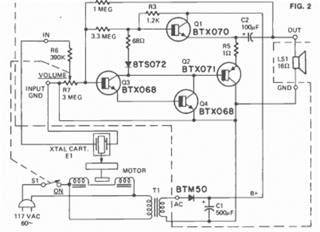 This is the circuit of a turntable from the 1970s. We found it in a repair article in the December 1974 Radio Electronics magazine. The circuit is mains powered.