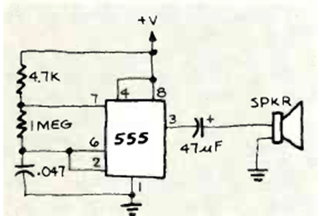 This simple oscillator can use 8-ohm or close to 8-ohm speakers. The circuit is from Radio Electronics from May 1982. The frequency can be changed by changing the 1 M resistor.