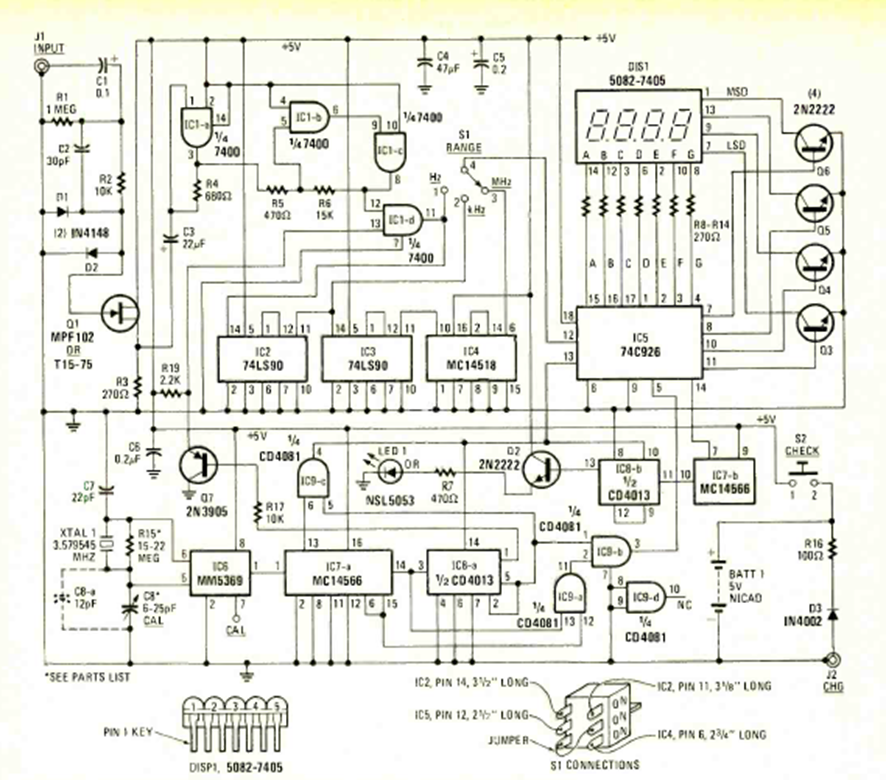 This circuit is from March 1978 Radio Electronics. The 4-digit circuit uses a period module and is battery powered. The main integrated circuits are CMOS and TLL.