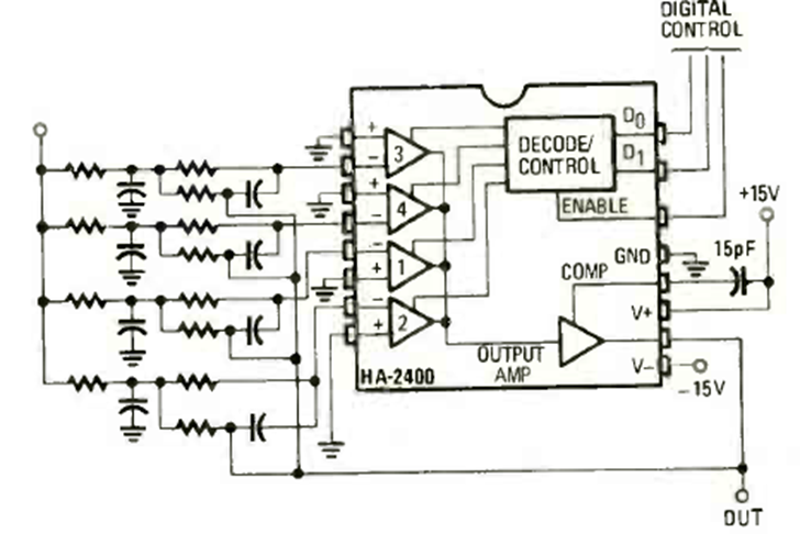 Through digital control, this circuit activates the input filters that have the frequencies selected by their components. The circuit is from Radio Electronics from March 1980. The integrated circuit is the HA2400.