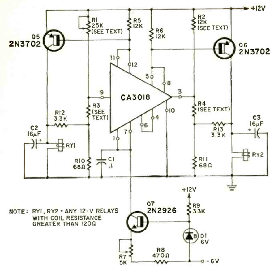 We found this circuit in the October 1970 issue of Radio Electronics magazine. It uses the then-new CA3018 integrated circuit from RCA. Some resistors are required for best performance.