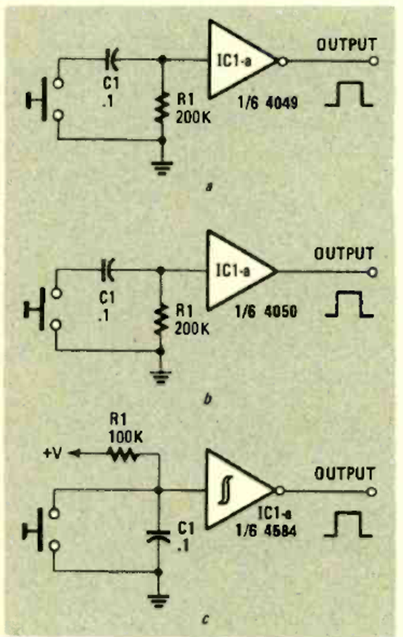 In the figure we have 3 monostable circuits for triggering without rebounds of CMOS circuits. The circuits are of types that can be found in several applications on this site.