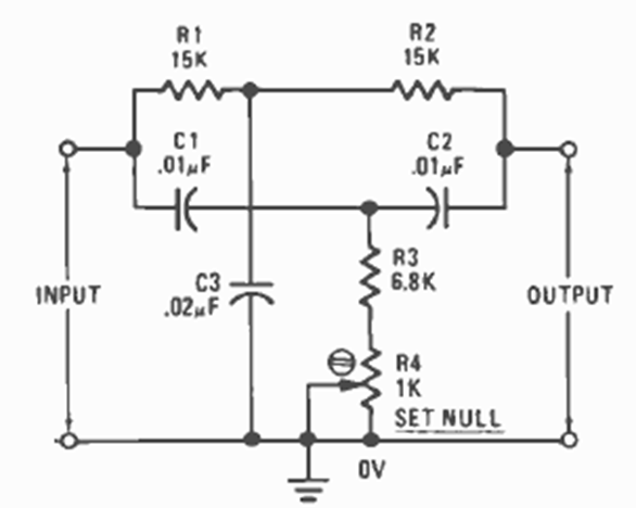 In the figure we have a basic double T filter with components that must maintain a specific range of values. The potentiometer controls the damping.