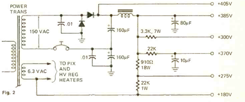 This power supply was featured in the December 1973 issue of Radio Electronics magazine. This type of circuit was used at the time to power tube televisions.