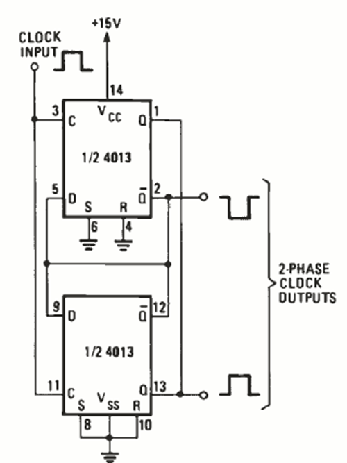 The figure shows how to obtain clocks in phase opposition using the 4013 IC. The circuit is from a Radio Electroncs from October 1986. The maximum frequency is a few megahertz.