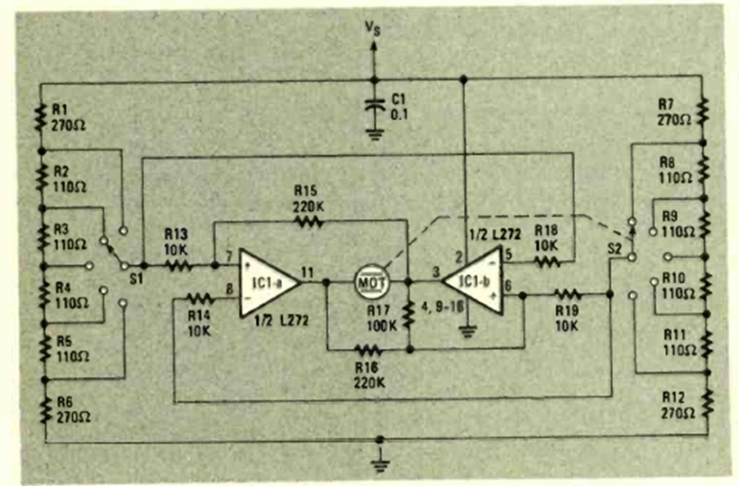 This DC motor control uses a power operational amplifier. We found it in December 1984 in the Radio Electronics magazine. The amplifier must be mounted on a heat sink and the maximum current is 1 A.