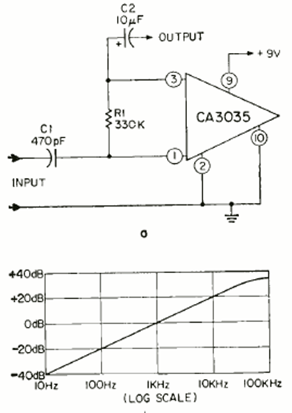 We found this treble booster circuit in a Radio Electronics magazine from February 1970. It uses an RCA CA3035 integrated circuit, which was released at the time.