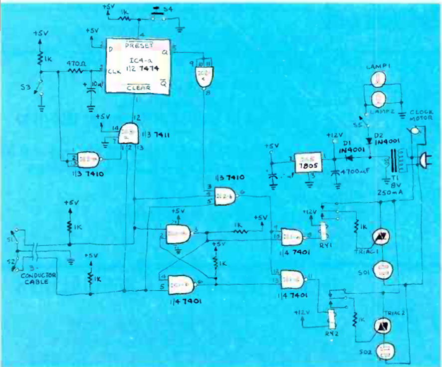 This circuit from Radio Electronics from February 1983 shows how to use a clock radio in home appliance control. The circuit uses Triacs and TTL logic.