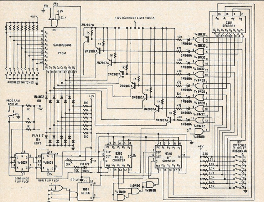 This is a typical circuit of a PROM programmer from the 70s. It appeared in the magazine Radio Electronics in 1979. Note that the programming was done manually byte by byte using switches.