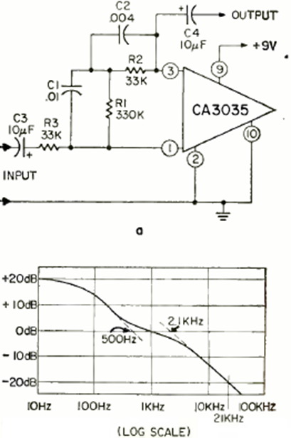 Using an RCA CA3035 integrated circuit, this turntable circuit was found in the February 1970 issue of Radio Electronics magazine. The response curve is given next to the diagram.