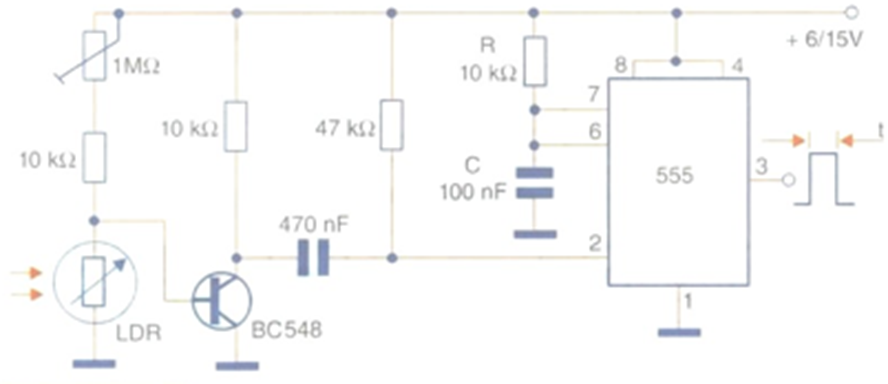A first circuit that uses a phototransistor as a detector and is suitable for covering short distances (up to 10 mm), and can also be used as an optical switch, is shown in the figure. This circuit activates a relay when the light beam that hits the phototransistor is cut. For very short distances, the light source can be a visible or infrared light emitting diode. The relay has a coil of up to 50 mA and a voltage according to that used to power the stage. It is worth remembering that this circuit produces a pulse only during the time that the object cuts the light beam and that, therefore, it does not have monostable action.